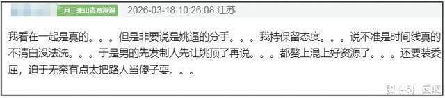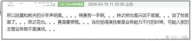 至于“姚晨逼迫侯雯元和钟楚曦分手”的爆料,有网友表示怀疑,可能是时间线确实不清白,男方提前下手甩锅。而且,还有网友拿姚晨和钟楚曦的态度夸侯雯元有手段,称他是钟楚曦唯一官宣的男友,也能让姚晨出来发离婚官宣。