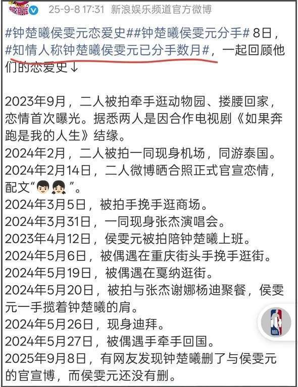 从时间线看,钟楚曦和侯雯元在2024年5月后就减少互动了,根据钟楚曦和现任恋爱一年的爆料,钟楚曦和侯雯元分手时间可能超过一年,这就比钟楚曦删官宣的时间早多了。巧的是,姚晨和侯雯元恋情爆料的时间也有一年多。